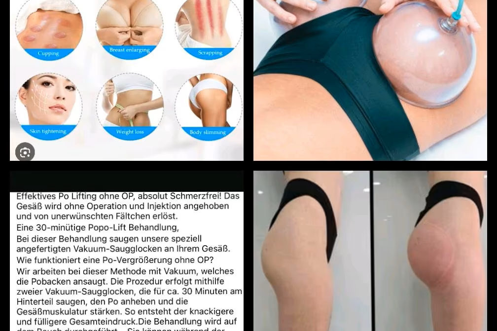 Eine "Vakuum Butt Lift" Behandlung ist eine nicht-chirurgische Methode, die Vakuumsauger verwendet, um die Durchblutung zu fördern und das Gewebe anzuheben, was zu einem strafferen und volleren Gesäß führen soll. Es handelt sich dabei um eine alternative Methode zum klassischen Brazilian Butt Lift (BBL), bei dem Eigenfett injiziert wird, da die Vakuumtherapie nicht-invasiv ist. Die Ergebnisse dieser nicht-invasiven Behandlung sind oft vorübergehend, können aber bei regelmäßiger Anwendung deutlicher werden.Auch andere Bereiche wie Brust können geliftet werden. Oder vauch angenehme Massen durchgeführt werden.